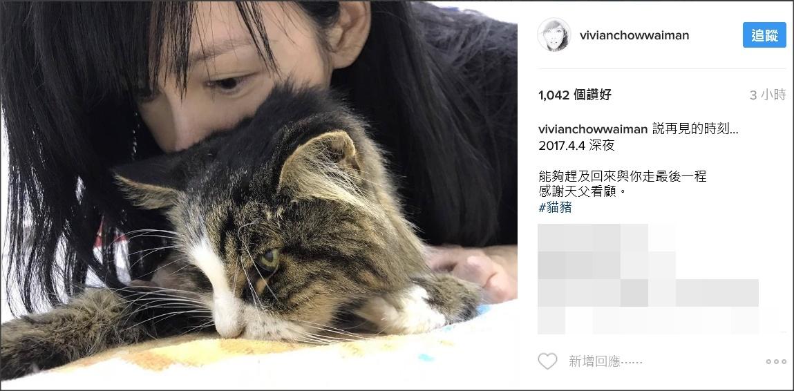 Vivian revealed her cat passed away on 4 April and left a message: "Time to say goodbye...... During the late night on 4 April 2017, I am able to return in time to send it off and thank you to god. Our oldest male cat completes the mission in earth and the heaven brings it back. My cat son is an angel which gives us lots of love and we love you forever!" The netizens left messages to console Vivian upon seeing her post.